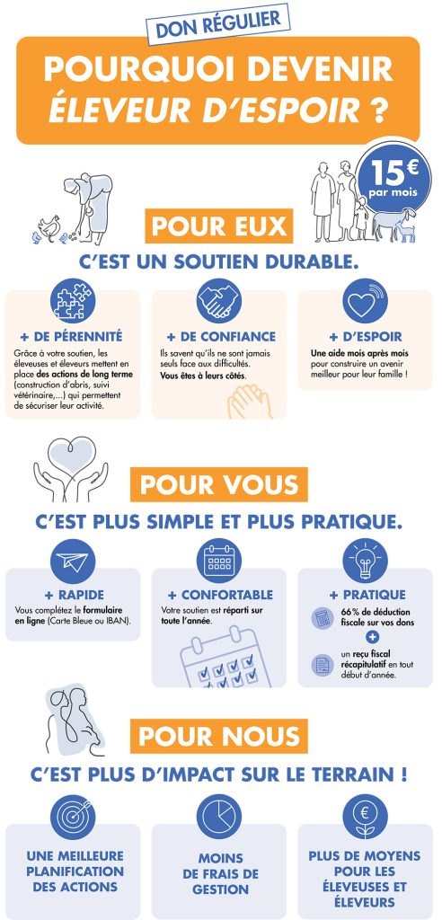 En tant que donateur régulier, vous soutenez chaque étape du projet toute l’année : formation, distribution d’animaux, alimentation, construction de bâtiments, suivi vétérinaire, appui à la commercialisation et mise en place de services de proximité.